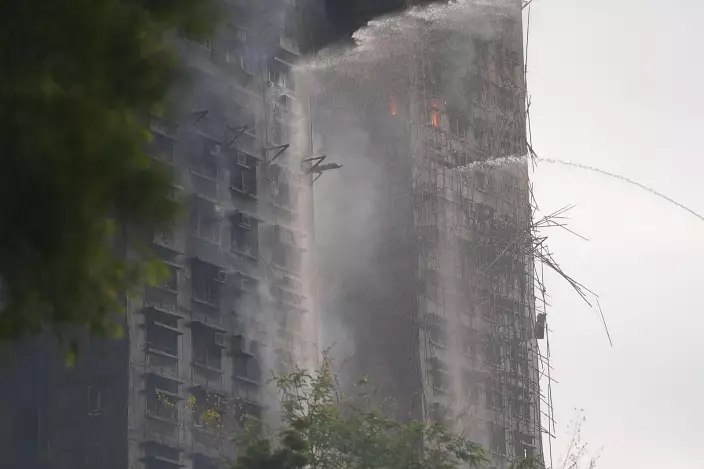 而宏福苑高層仍可見多個單位冒出明顯火光與濃煙,部分位置間中有火舌再度冒起,零星火勢未完全撲滅。至少五部雲梯車正向高空持續射水,滅火工作於九點半仍未停止。