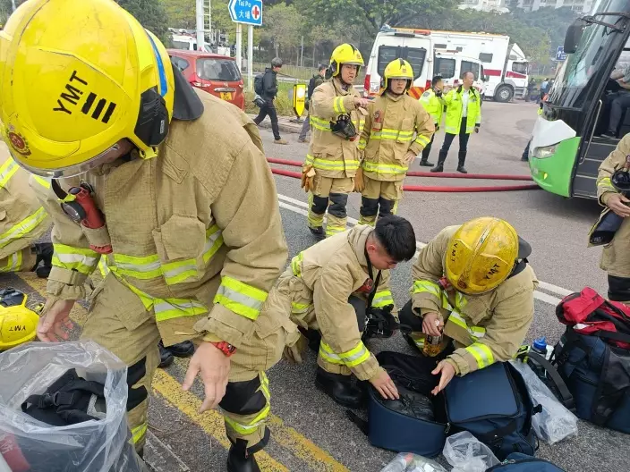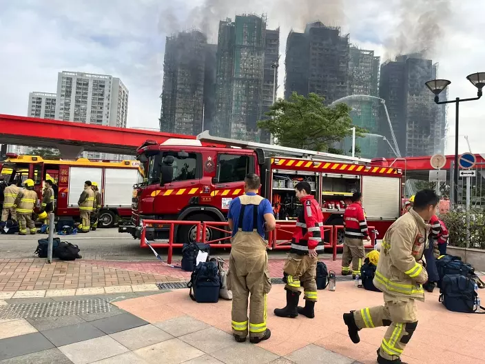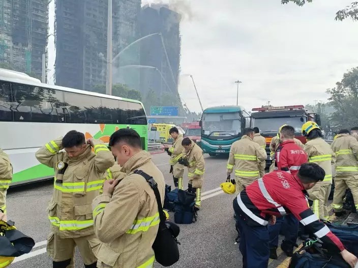 今晨近10時,在宏福苑火災現場,但見大批已通宵達旦撲火、穿著被熏黑防護衣的消防員,拖着疲乏身驅準備換班;據知,有不少消防員緊急待命,取消休假準備走上火場協助救援。