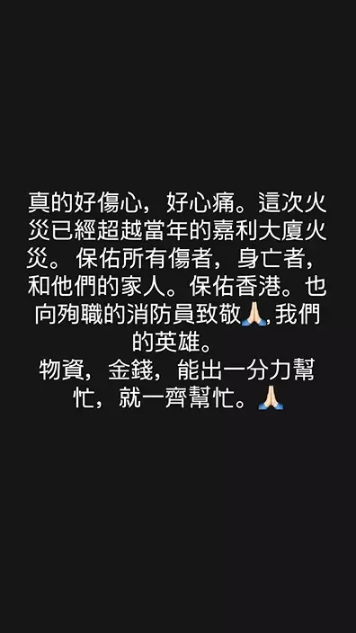 藝人李施嬅(Selena)今日在社交平台對事件作出回應,對傷亡感到沉痛,並呼籲全城為受影響居民集氣祈願。她寫道,看到消息後「真的好心痛」,盼望災民平安無事,亦對救援人員的努力深表感謝。