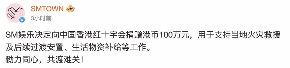 SM娛樂作為首間韓國娛樂公司向香港捐款100萬港元。SM娛樂官方微博截圖