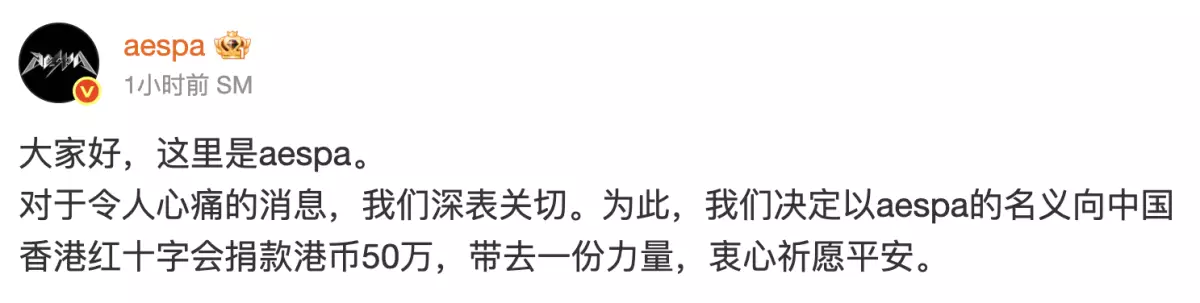 SM娛樂旗下女團aespa額外捐款50萬港元。aespa官方微博截圖