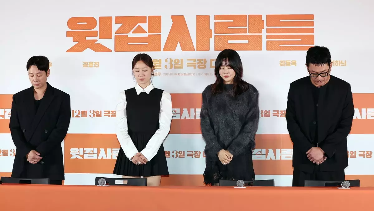 河正宇、孔孝真、金東旭、李荷妮在新片試映記者會開始前一起站立默哀。網上圖片