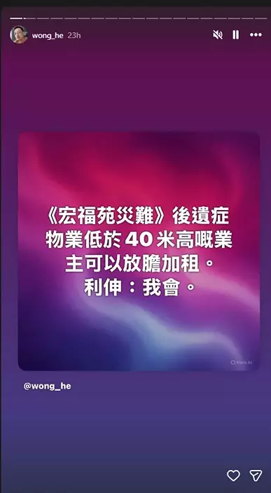 其中一則帖文稱:「《宏福苑災難》後遺症——物業低於40米高嘅業主可以放膽加租。利伸:我會。」