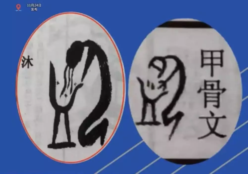 綜合內媒報導,內地社交平台瘋傳一則「猜猜甲骨文是甚麼字」的帖文,掀起網民熱議。這張引發關注的甲骨文字形象呈現一名人物俯身靠向盛器,頭部垂落幾條線條似是「洗頭」的姿態。
