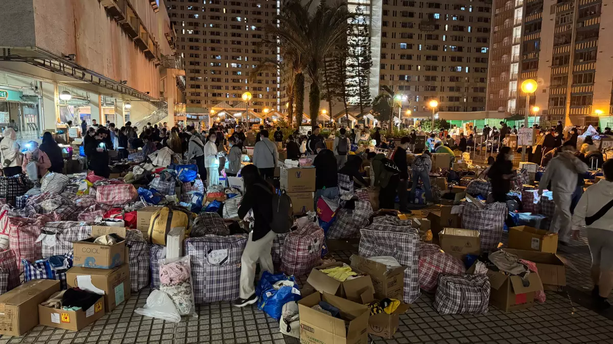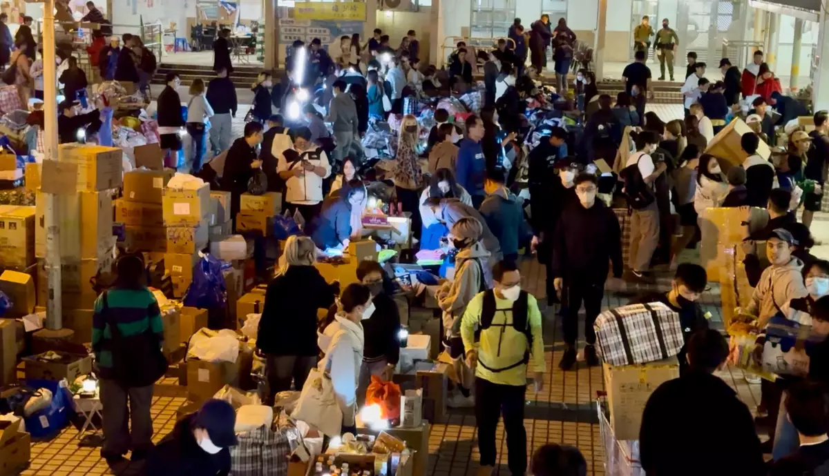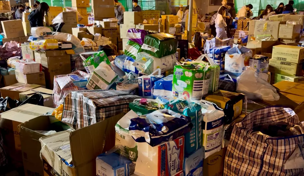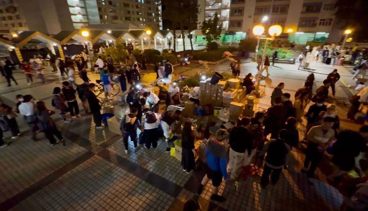 在受影響市民入住的其中一個態這護中心廣福社區會堂,在晚上有大批市民帶備各項物資前來,豐富的物資堆滿廣福社區會堂外的平台,為了可以有序地分發資,市民自發地將物資收捨整齊。