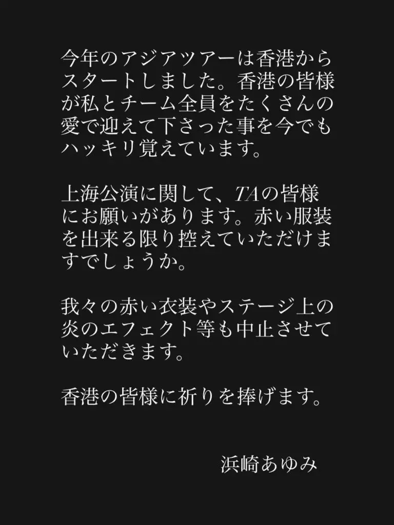 濱崎步將於本周六(11月29日)在上海的東方體育中心開騷,昨日(11月27日)她以在IG以英文及日文發文,表示今年的亞洲巡演從香港開始,觀衆給了她與整個團隊滿滿的愛與鼓勵,「關於上海的演出,我請求工作人員盡量避免穿著紅色衣服,舞台上我們也將取消紅色服裝及煙火效果。我們為香港祈禱」。