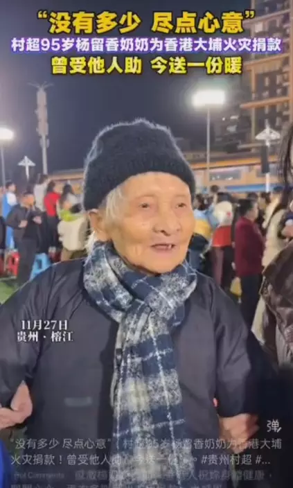 村超95歲楊留香奶奶也來到球場上親自捐獻,她說:「都捐五十塊,別人幫助我們,但我們呢?到我們(幫人)來了,沒得多少,只有點點幫助,榕江大水災,全國各地的人都關注我們榕江,都支援我們榕江,現在就只想來獻一點自己微薄的愛心。」讓人動容,她最後還豎起大姆指叫讚。