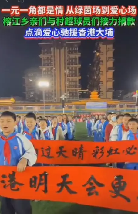 大埔宏福苑五級火慘劇,引起八方支援,除了熱心港人的一呼百應,在內地偏遠的貴州省榕江縣民眾,27日晚上都聚集到「村超」足球場,為大埔宏福苑火災受災群眾捐款,有數千人參加,整個綠茵場都擠滿前來支持香港的民眾,包括小學生、長者和「村超」球員等,學生還舉起「香港明天會更好」的橫幅,讓人倍添溫暖。