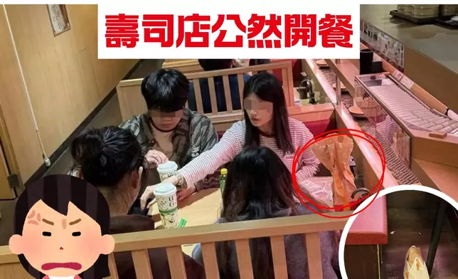 香港大部份食肆都不歡迎顧客外帶食物或飲品,但日前有網民在人氣日本連鎖壽司店見到有食客公然在場享用手撕雞、快餐店薯條和杯裝飲品,離開前更將外賣垃圾留在地上,十分離譜!