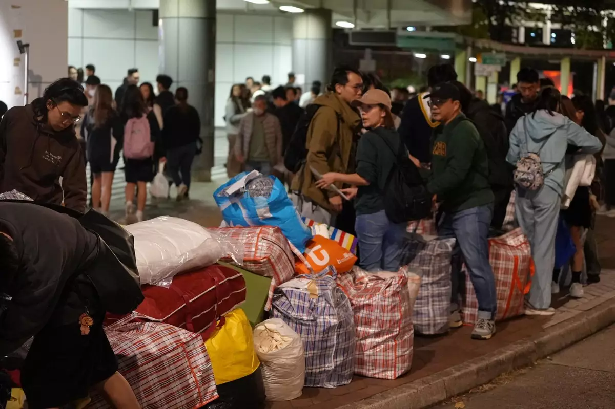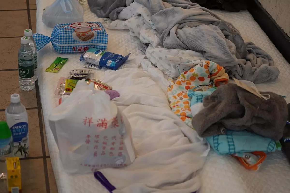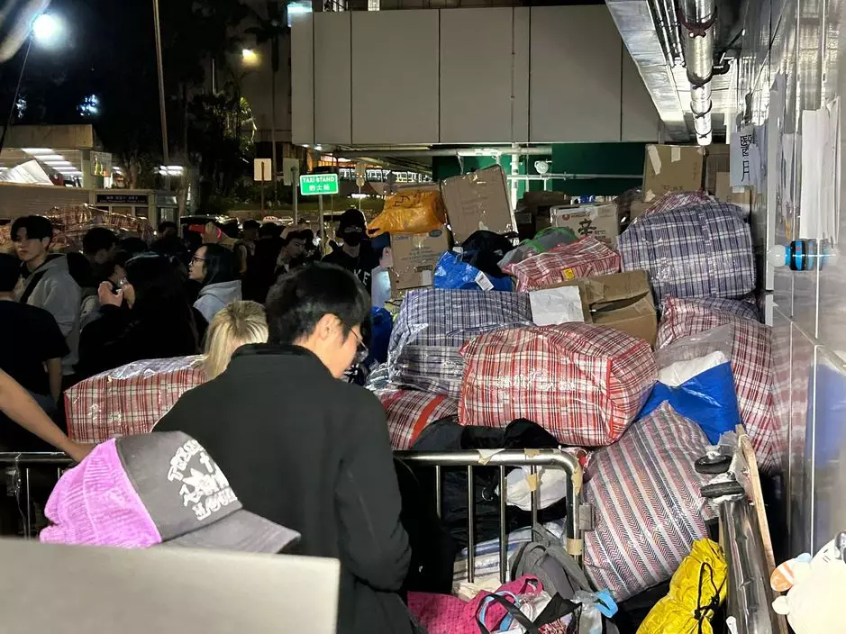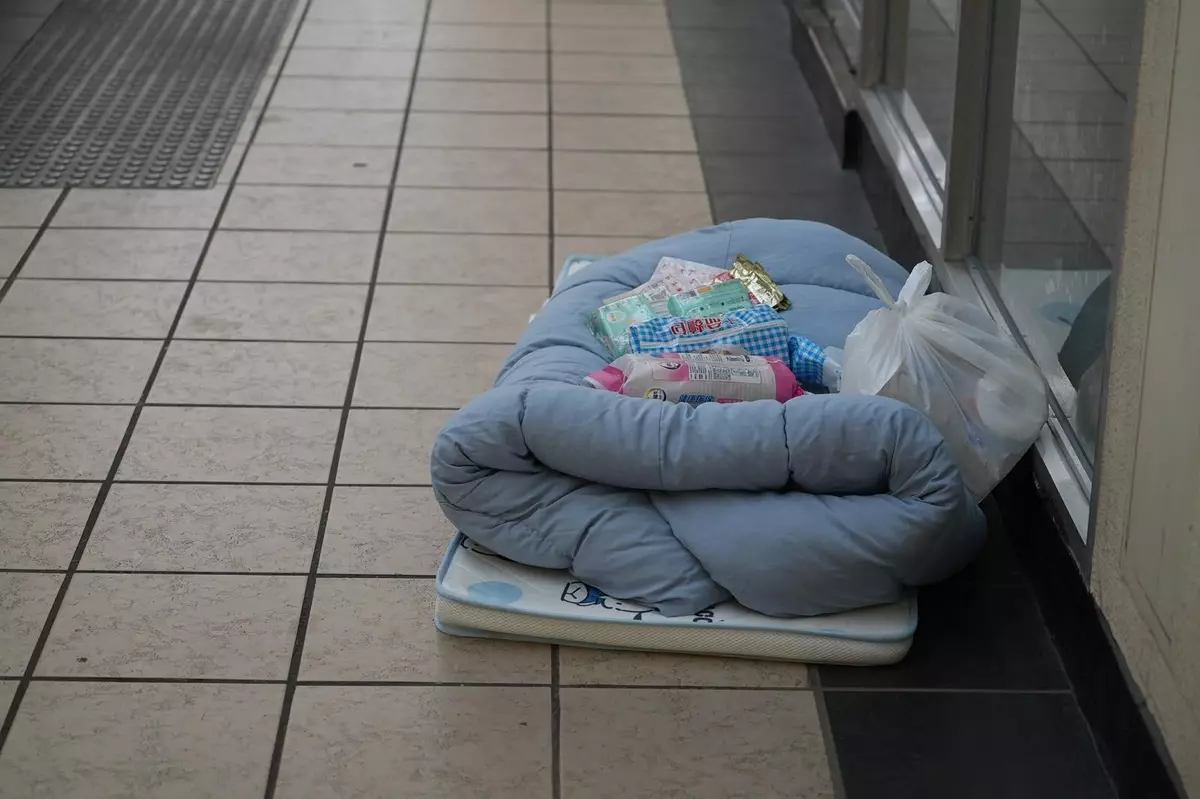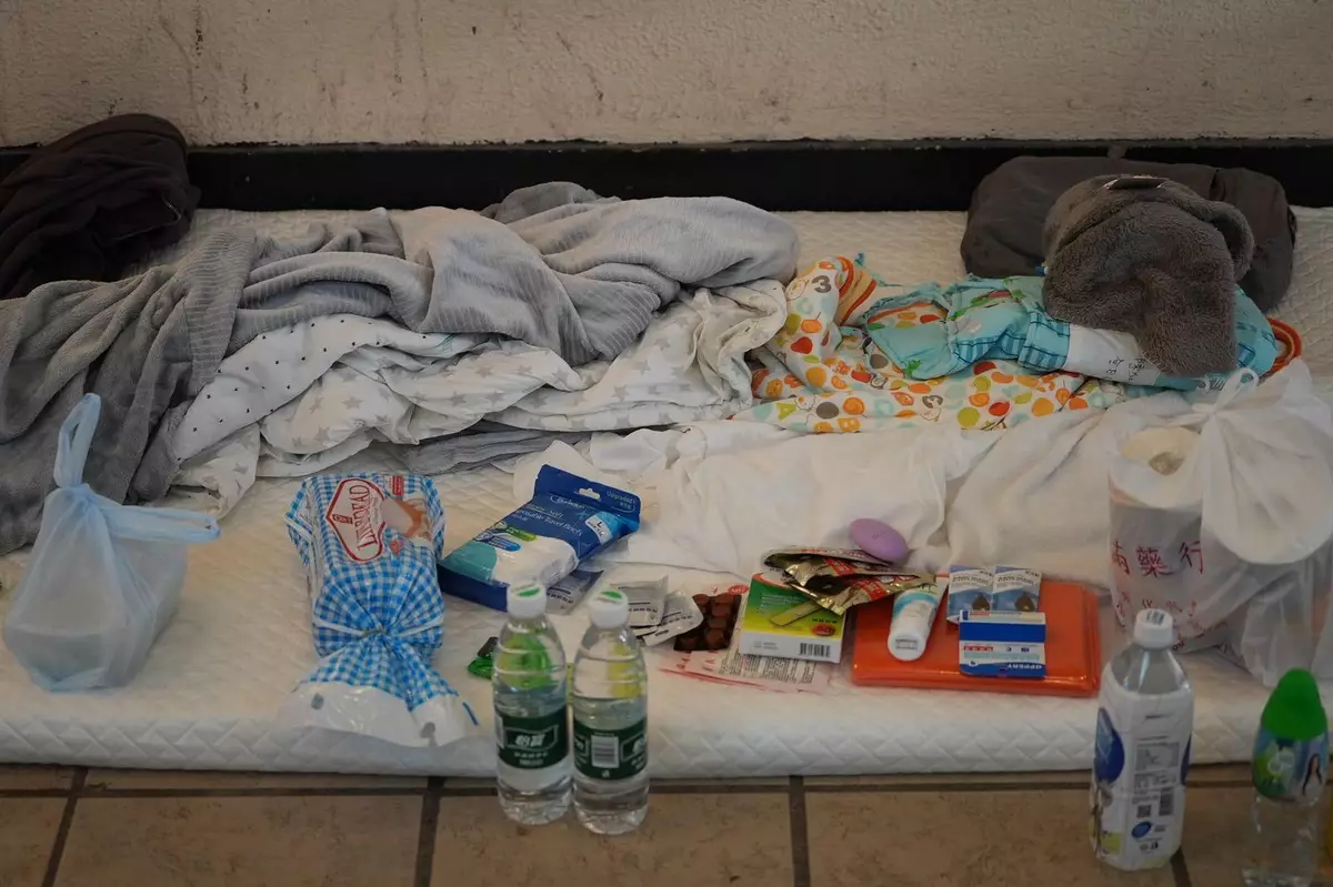 部分居民在商場及屋邨公共空間搭建簡易地鋪休息,床褥旁放有水、餅乾、衛生用品等。巴士的報記者攝