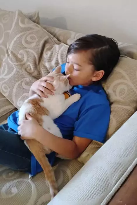 「Peach」性格溫馴,經常陪伴在男童身邊,睡覺時緊貼著他,走到哪便跟到哪,仿佛深知這名孩子曾以自己最珍愛的滑板換回牠的一條性命。這份純粹而無私的善意感動了大眾,Zayin也因此獲得 ASPCA 頒發「年度勇敢兒童獎」。在頒獎典禮上,他靦腆說道:「滑板可以再買,小貓的命不能重來」。