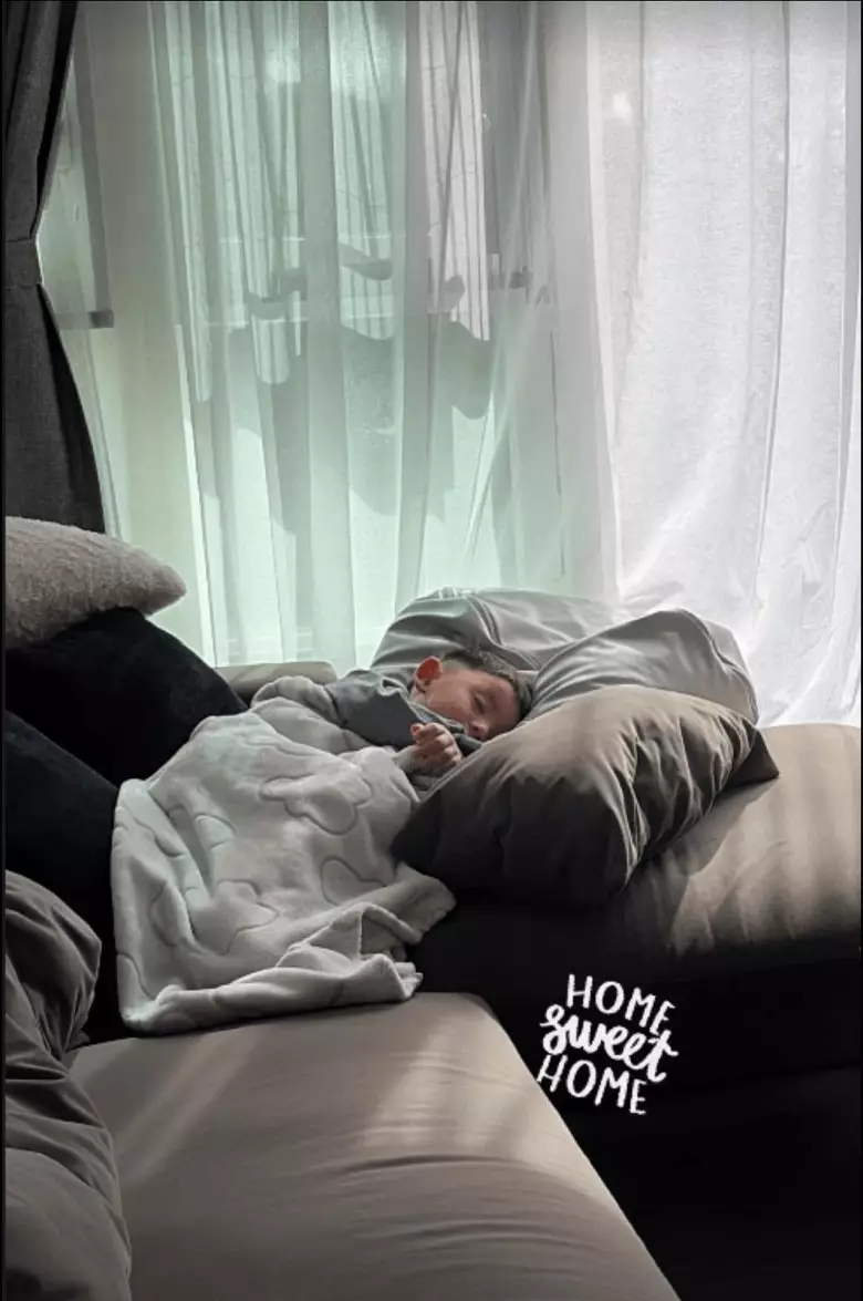 老公施雋賢亦撰文寫道:「Feel better soon & I wish I can take away the pain you're feeling my son」。他還特別大讚太太是超級媽媽「Super mummy」。施雋賢隨後又通過IG透露仔仔已出院回到家中,並分享了一張幼子躺在家中梳化熟睡的相片,並寫上「Home Sweet Home」。
