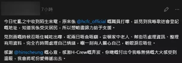 張敬軒歌迷會主動向歌迷會的受災歌迷伸出援手。