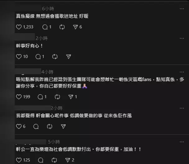 據悉,張敬軒與歌迷會職員根據會員登記地址,迅速識別受影響居民,並親自送上慰問與物資。一名受災歌迷在網上分享經歷,指在忙亂中接到歌迷會來電指在忙亂中接到歌迷會來電,見面時感動落淚,感謝對方在艱難時刻送上溫暖。網友紛紛留言讚賞張敬軒的低調善舉,稱其「從未讓人失望」。