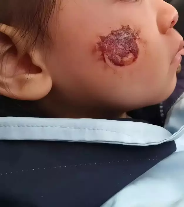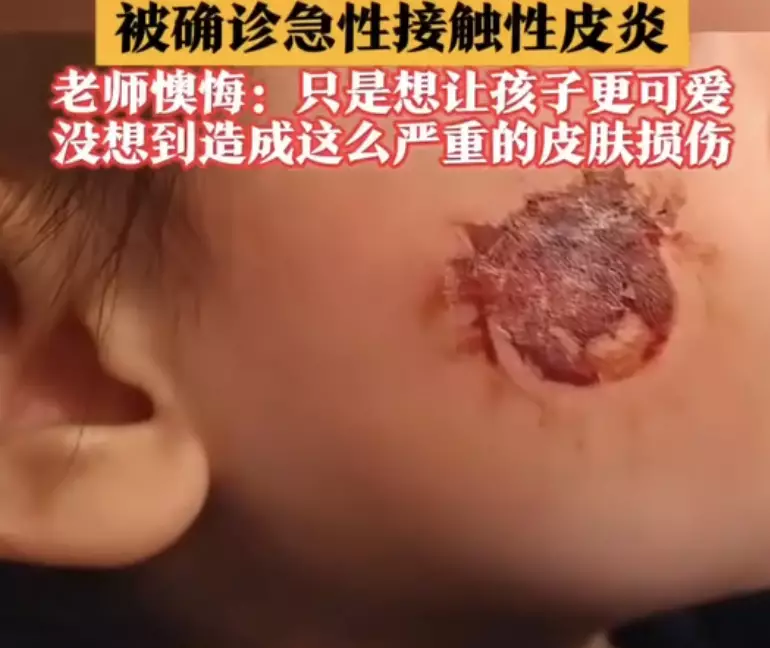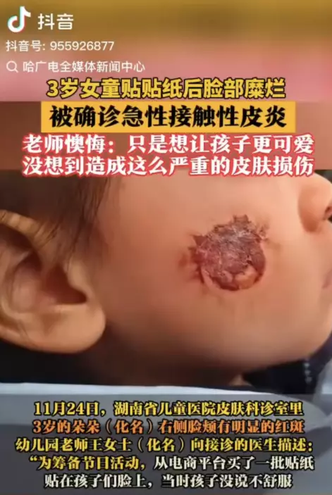 近日,湖南省一名3歲女童朵朵(化名)參加幼稚園節日活動時,按王姓女老師(化名)指示將可愛貼紙貼在臉上。豈料,當晚返家後右臉開始出現輕微紅斑,家長起初未多加理會。惟數日後,紅斑迅速擴散並冒出水泡,破裂後形成糜爛與結痂,情況極為嚴重,家長見狀緊急送往醫院求診。