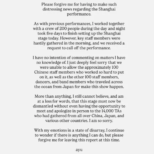 主辦單位28日下午公布,因為不可抗力因素取消演唱會。濱崎步在社交平台說,28日早上接到取消演唱會的通知,自己難以置信,請求大家理解。