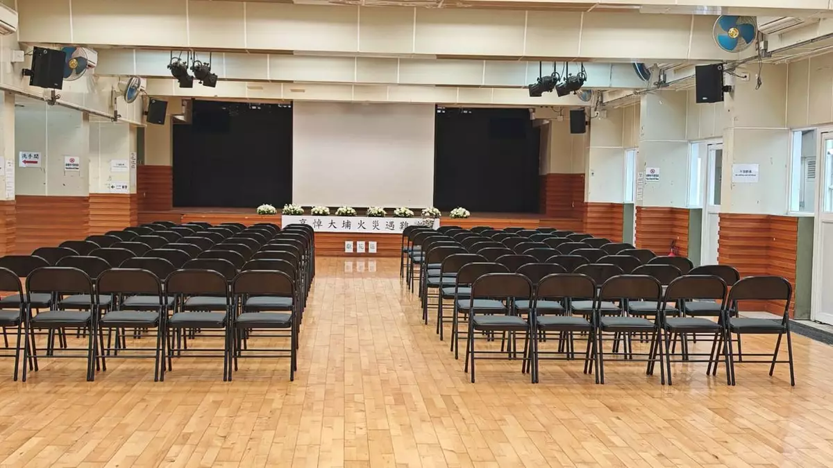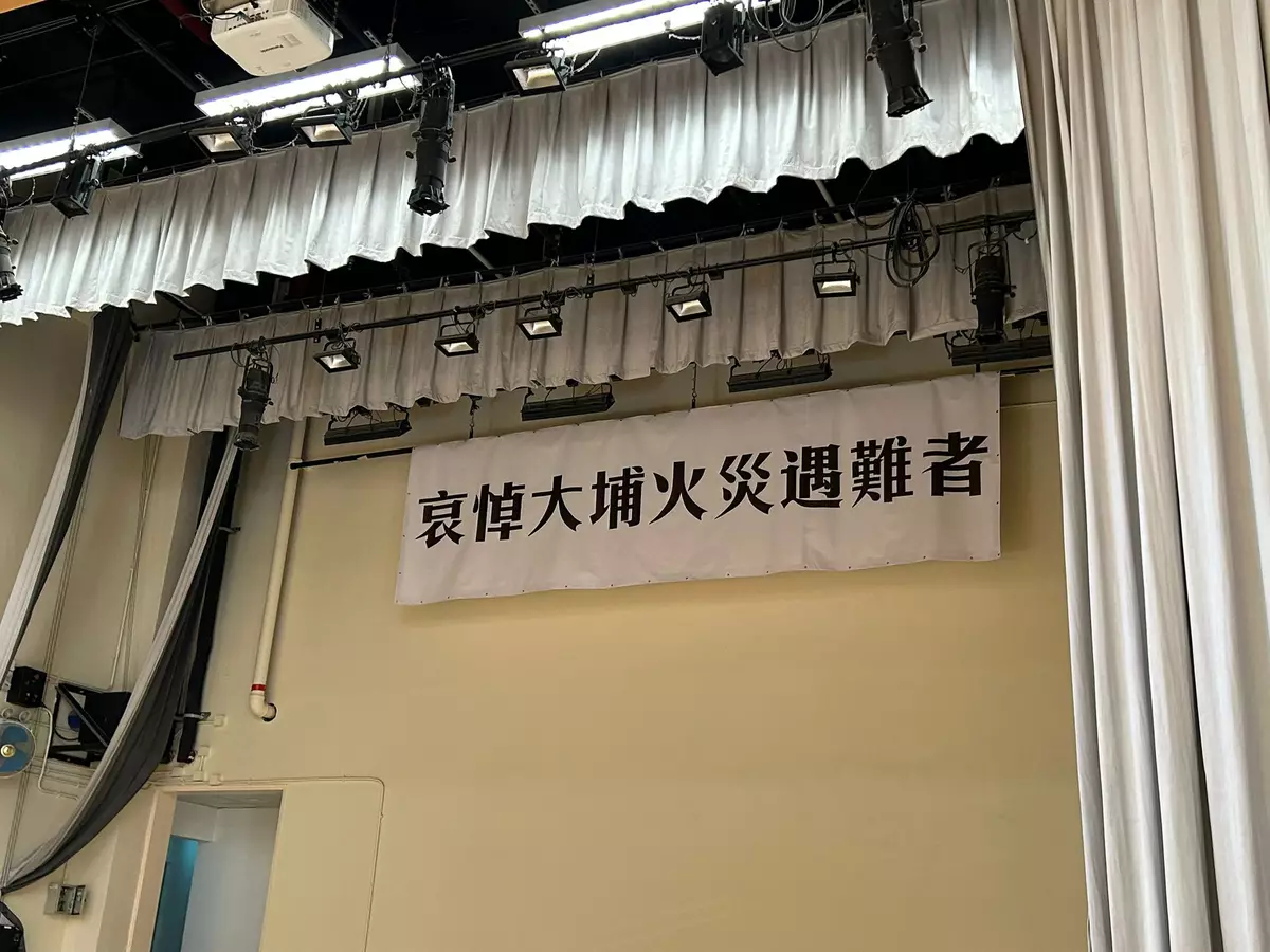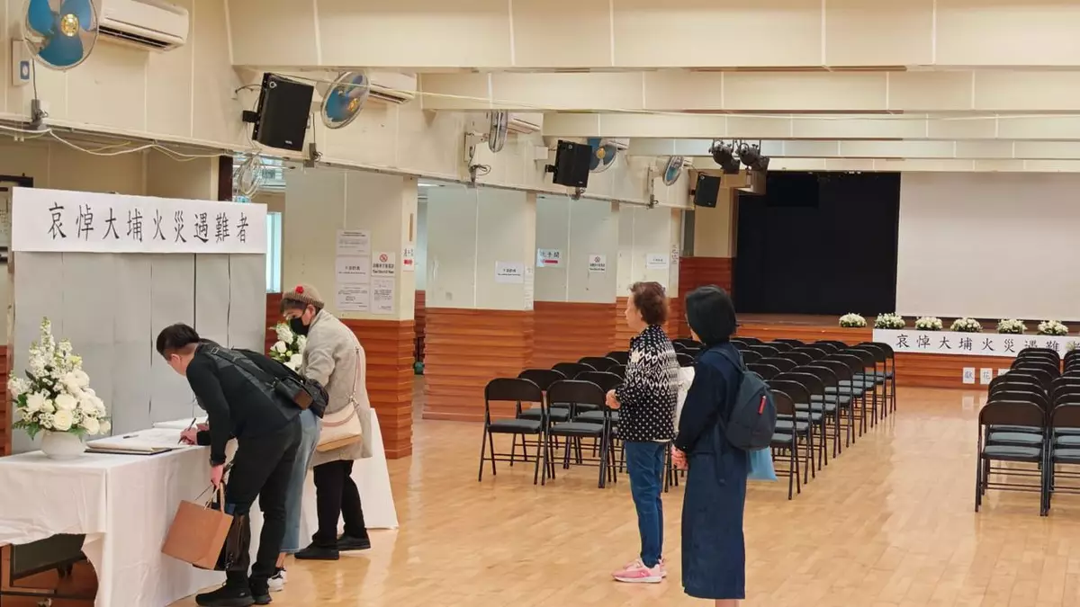 其中在大埔富亨鄰里社區中心的禮堂,擺放了多束白色鮮花,並掛上白底黑字、寫上「哀悼大埔火災遇難者」的橫幅。