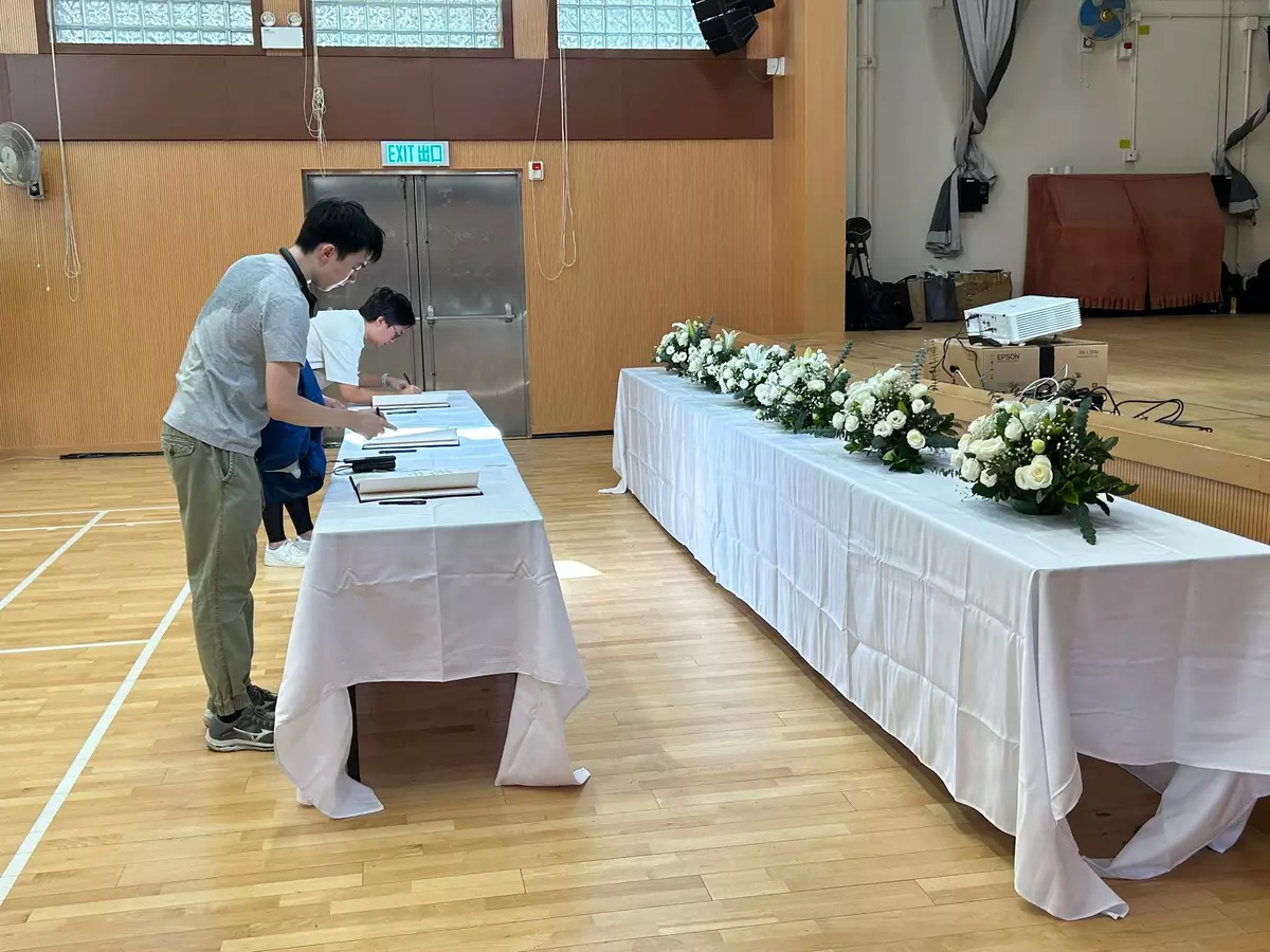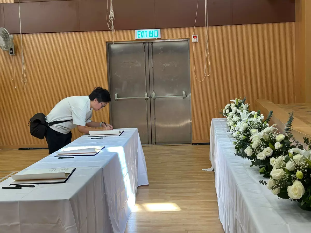 市民到弔唁處簽署弔唁冊,弔冊處前方擺放了白花,背後掛上悼念橫幅。巴士的報記者攝
