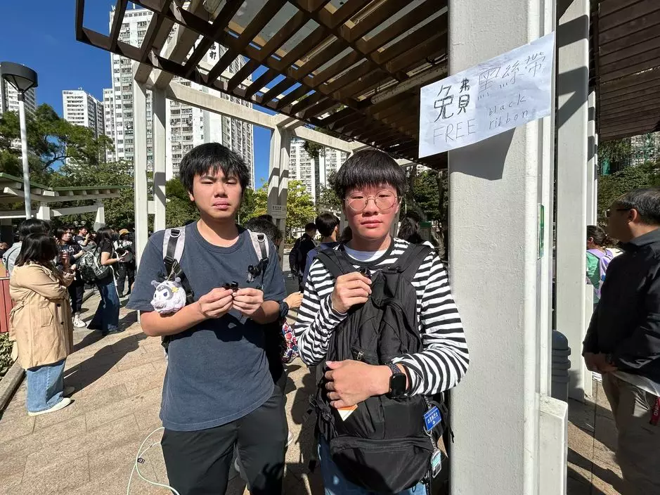 林同學(右)和周同學(左)向前來弔唁的民眾免費派發黑絲帶。巴士的報記者攝