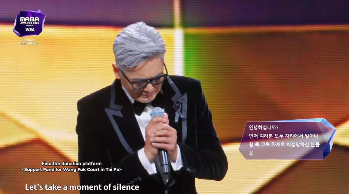 一頭白髮的發哥戴上眼鏡、穿上黑色西裝,胸前扣上黑絲帶登場,他在台上神情肅穆,請求所有在場觀眾起立默哀,為大埔宏福苑居民,給予衷心祝福,「喺我頒獎之前,我有一個小小請求,希望大家一齊起立,為大埔宏福苑嘅居民,送上衷心嘅祝福。」發哥先後以廣東話、普通話及英語訢說這個請求,期間更一度哽咽!而全場觀眾聞言即時響應,會場燈光亦馬上熄滅,氣氛壯嚴,進行默哀,為大埔宏福苑居民致以最衷心祝福。