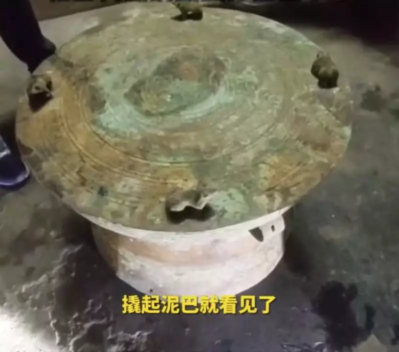 廣西村民挖蚯蚓掘出千年古銅鼓,保存至今完好仍可發出清脆鼓聲。影片截圖
