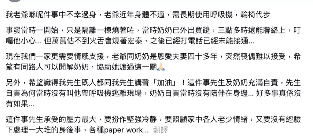 該名新抱在社交平台發文,指老爺需長期使用呼吸機及輪椅代步,不幸是火警發生時奶奶外出買菜,曾在電話叮囑對方要小心,但之後失去聯絡,最後傳來噩耗。事發後,奶奶和身為兒子的丈夫都感到自責。