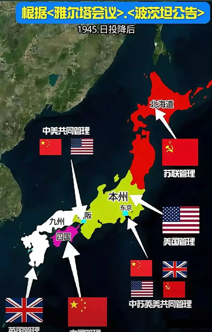 日本再來一次,不是「向死而生」而是「向死而亡」。金燦榮教授舖出一幅「根據〈雅爾塔會議〉,〈波茨坦公告〉,1945年,日本投降後」的貼圖,示意日本應受中、美、蘇、英四國的分割管理,如果當年落實執行,即日本「亡國」。