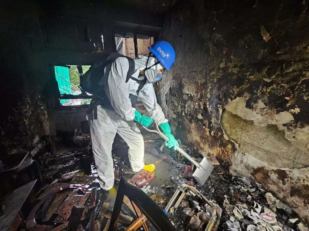 DVIU人員仔細搜索單位內每處角落,在灰燼中尋找有用證物。香港警察FB圖片
