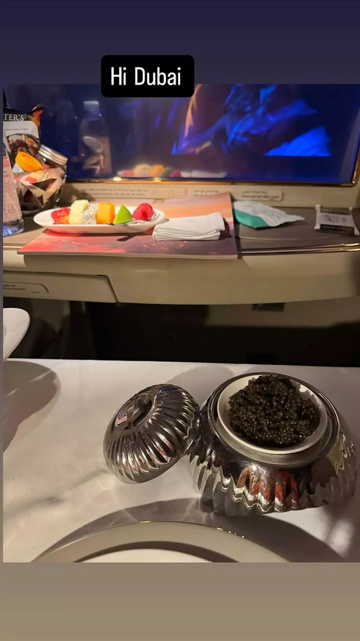李美慧日前在IG發現照片並寫道「Hi Dubai」,透露正前往迪拜旅行。照片中她安坐在飛機頭等艙內,一邊睇電影,一邊歎名貴魚子醬,極致奢華。