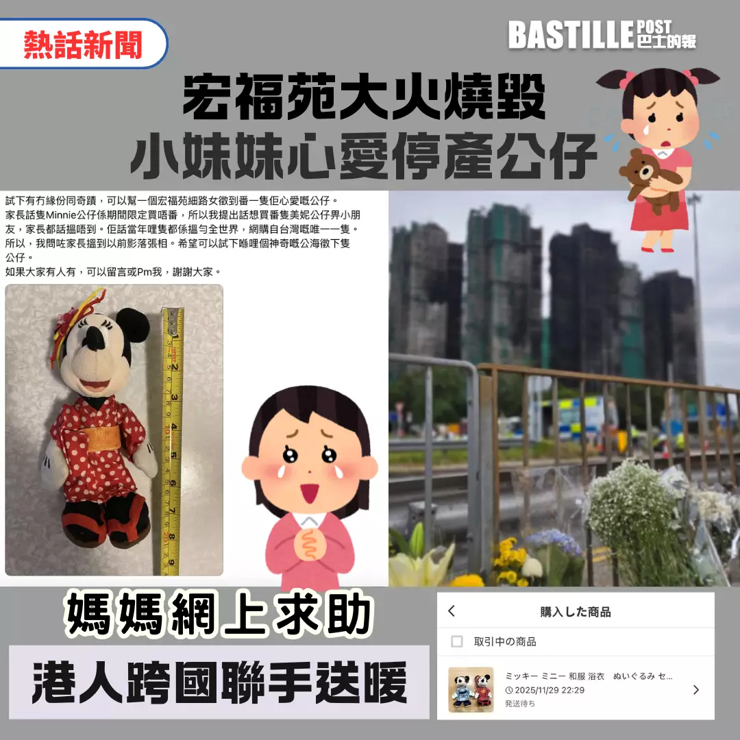 一場大埔宏福苑五級大火,令不少居民痛失家園及珍貴回憶。連日來,全城都陷入哀傷中,不過在火災陰霾下,一個暖心的尋物故事為大家帶來安慰。一群熱心的網民發起行動,聯手為一名小女孩尋回在火災中失去的珍貴公仔。