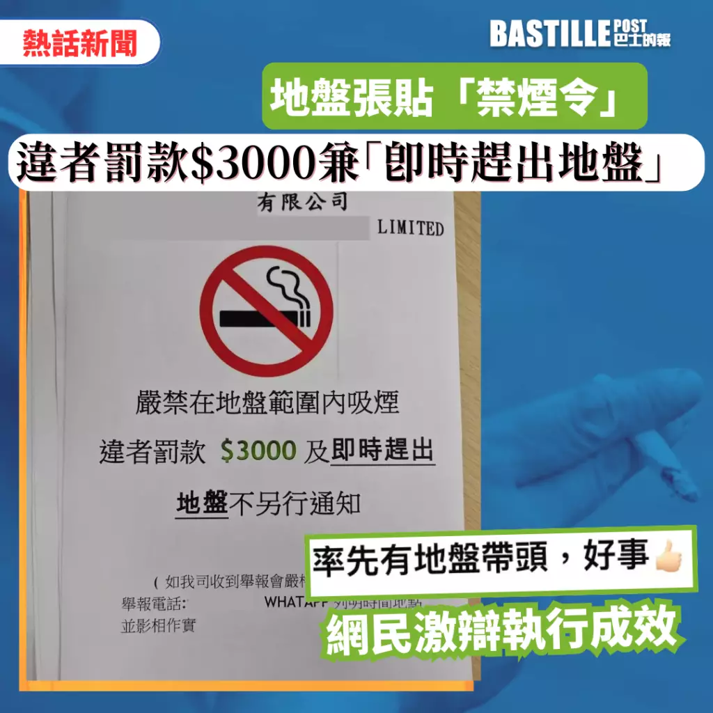 大埔宏福苑五級大火後,有網民在社交平台分享,指有地盤迅速張貼嚴厲禁煙通告,以紅底黑字標明「嚴禁在地盤範圍內吸煙」,並附上大型禁煙圖示,警告意味濃厚。