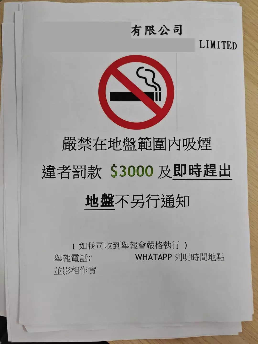 通告列明,違例者將被罰款3000元及即時驅離地盤,且不另行通知。其中「即時趕出地盤」以粗體黑字突出,同時設立WhatsApp舉報渠道,要求舉報者提供時間、地點及照片為證,並強調「收到舉報會嚴格執行」。發文者形容此舉是「率先有地盤帶頭」。