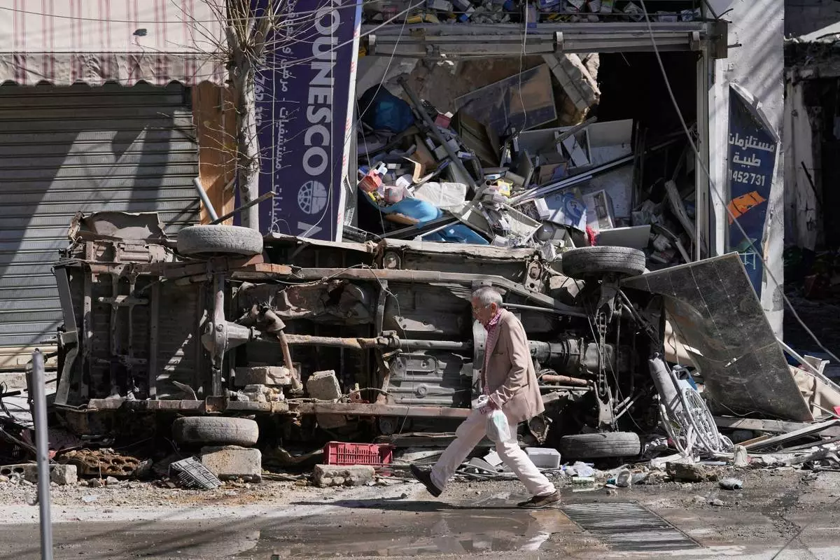 2026年3月5日周四,黎巴嫩南部納巴蒂耶鎮一條商業街遭到以色列空襲,一名男子經過被毀的汽車和商店。(美聯社圖片/Mohammed Zaatari) AP圖片