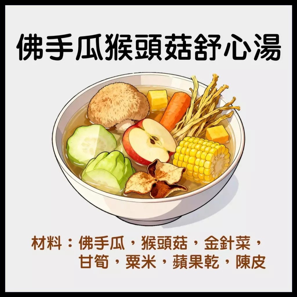 針對火災後常見的失眠、心悸等不適症狀,義工組織提供多款簡易湯方。其中佛手瓜猴頭菇舒心湯選用佛手瓜、猴頭菇、金針菜等材料,特別適合鬱悶心煩、胃納不佳者飲用,具有清熱解鬱、改善睡眠的功效。益氣靈芝安神湯以靈芝、茯神、蓮子為主材料,適合心神不寧、氣血虛弱者服用。而甘麥大棗湯則以小麥、甘草、紅棗簡單配伍,能有效緩和焦慮心悸,特別適合情緒恍惚、容易受驚人士。