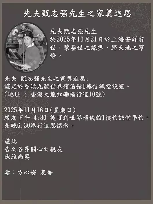前亞視小生甄志強於10月21日在上海離世,終年59歲,喪禮於11月16日在香港世界殯儀館設靈。靈堂布置簡潔,中央放置遺孀方心媛的心形花牌,寫上「永懷心扉」,寓意深長。