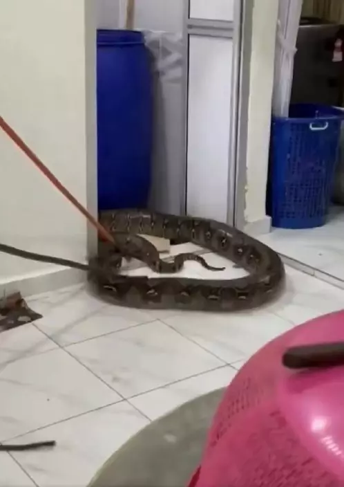 馬來西亞一條重逾60公斤的巨蟒壓破民宅浴室天花板直墮地面令屋主一家驚嚇不已。