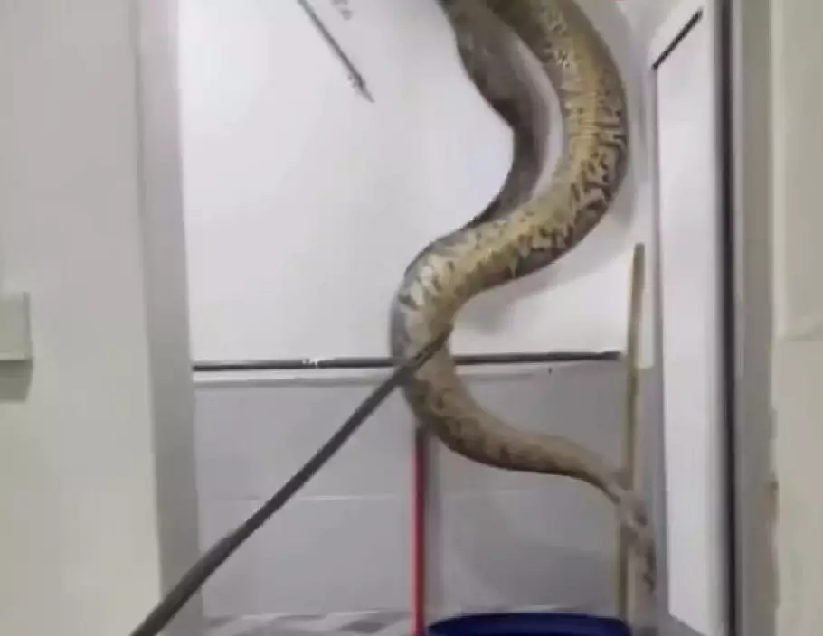 60公斤巨蟒壓破民宅浴室天花板直墮地面嚇壞屋主一家。影片截圖