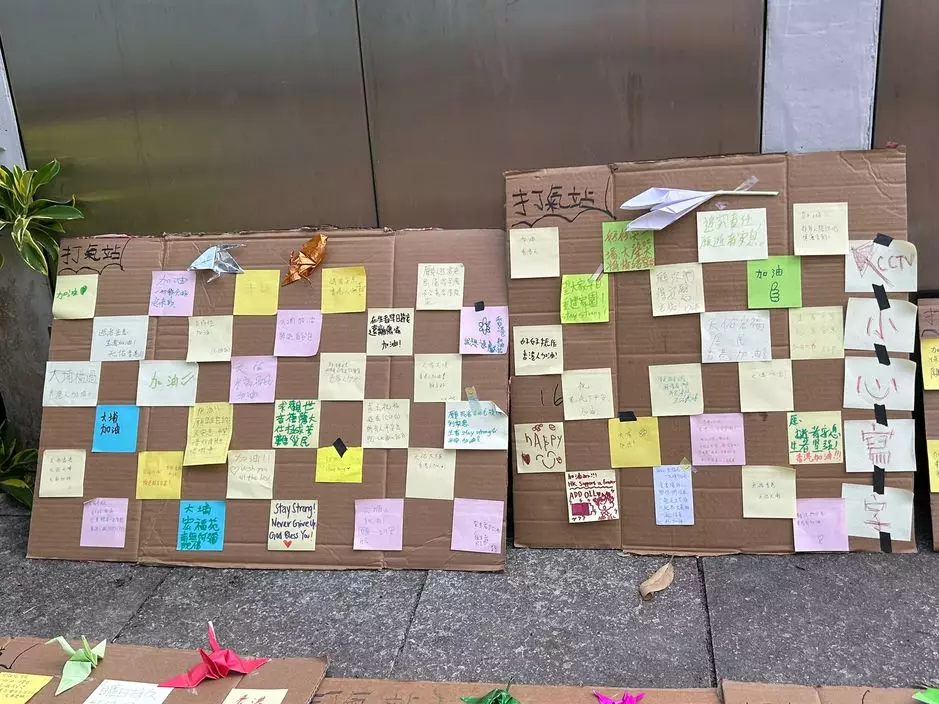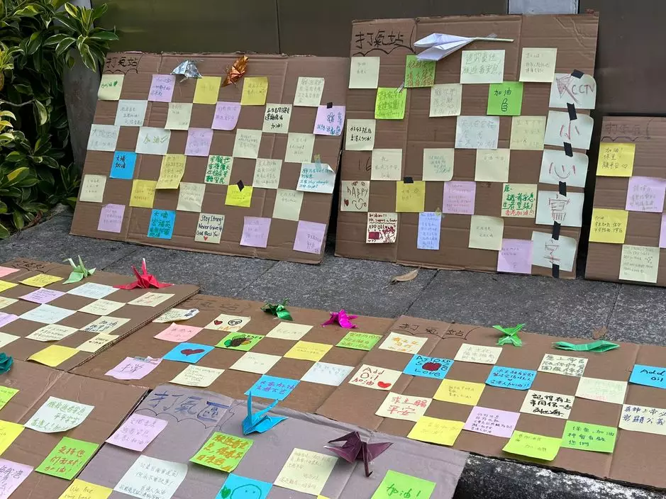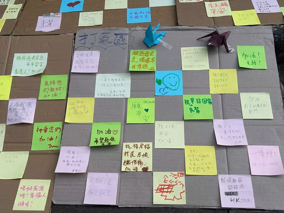 大埔宏富苑一場大火,無情地奪走逾150名居民的性命,近日不少市民都懷着沉重的心情前往火災現場獻花悼念。而今日記者發現在供獻花弔唁的平台上,有不少寫滿祝福話語的打氣牌,亦有一堆堆寄託哀思的千紙鶴。原來這些都是出自一隊民間組織,希望以此方式撫慰受災民眾。