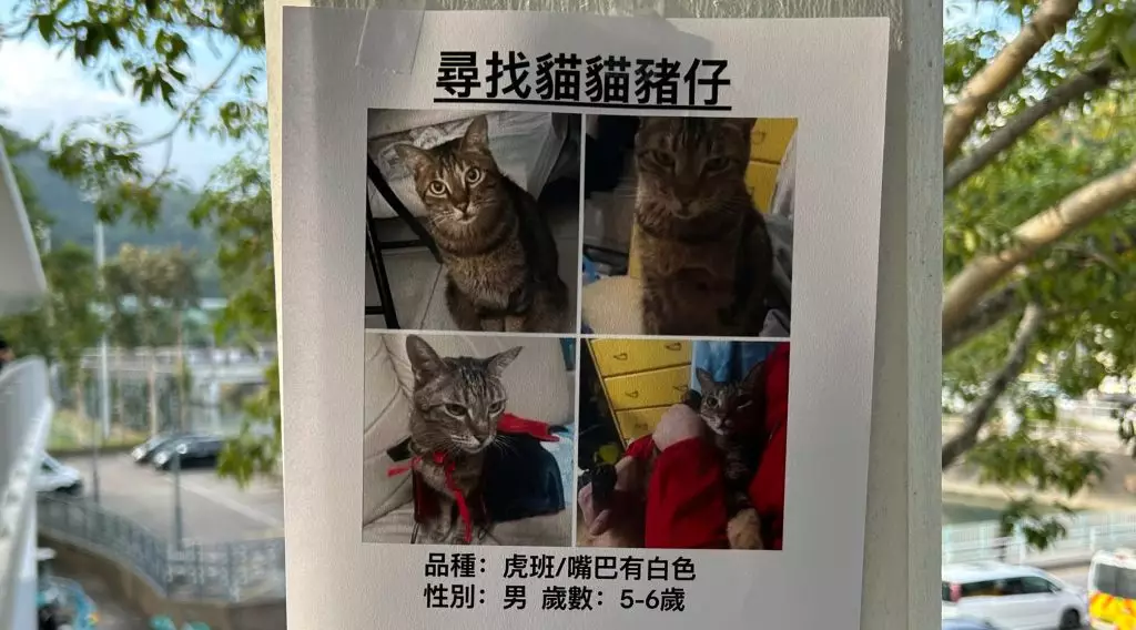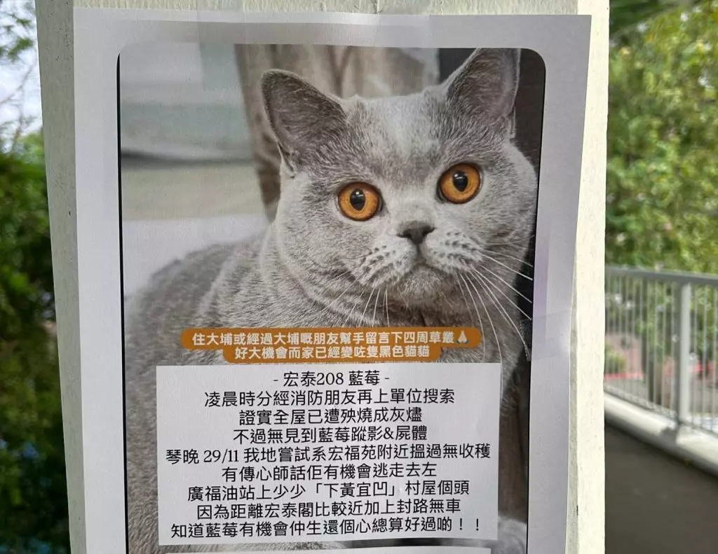 在宏福苑外,連日來都有見到一些搜尋失聯寵物的啟示。記者電聯其中失聯貓仔「細佬仔」同埋「錫仔」的主人,主人表示,她的家中一共養有八隻貓仔,雖然截至目前,仲差呢兩隻貓仔未搵到,但其餘六隻貓仔均在先前的搜救中,被消防員順利救助,平安送到她手上。