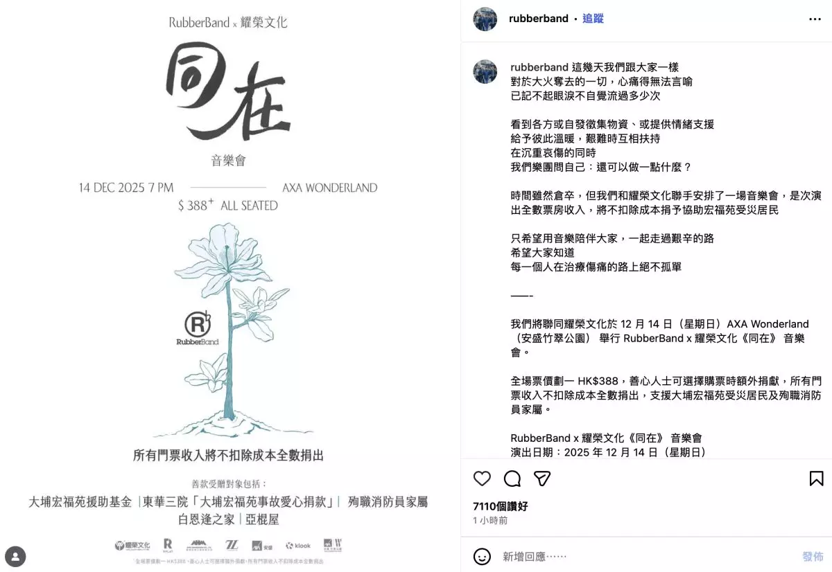 RubberBand將於12月14日舉行「RubberBand x 耀榮文化同在音樂會」, 支援大埔宏福苑火災受影響社群。