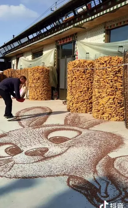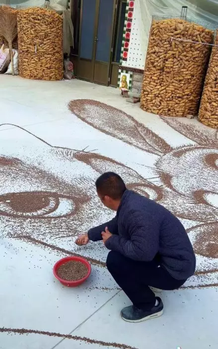 巧手男花費6小時用25公斤黑小麥擺出15平方米巨型穀物畫。影片截圖