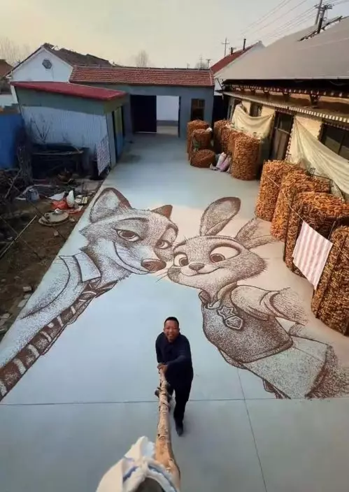 近日他受電影《優獸大都會》啟發,先在自家院落以粉筆勾勒電影主角茱蒂與尼克的輪廓,再以25公斤黑小麥沿線逐粒排出形狀,完成後更將手機綁在木棍上,由高處調整構圖比例,最終成功「搓製」出一幅達15平方米的穀物巨畫。