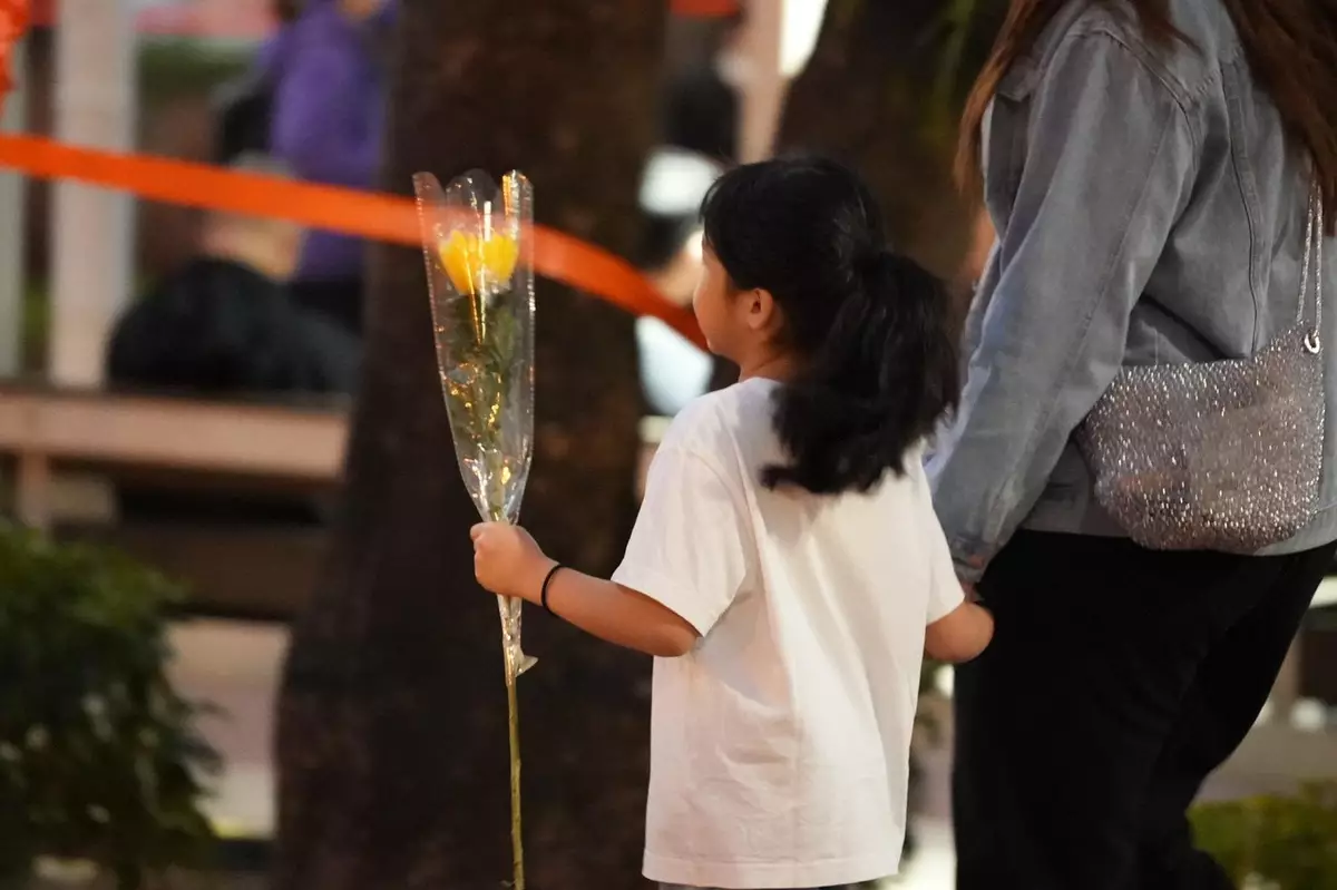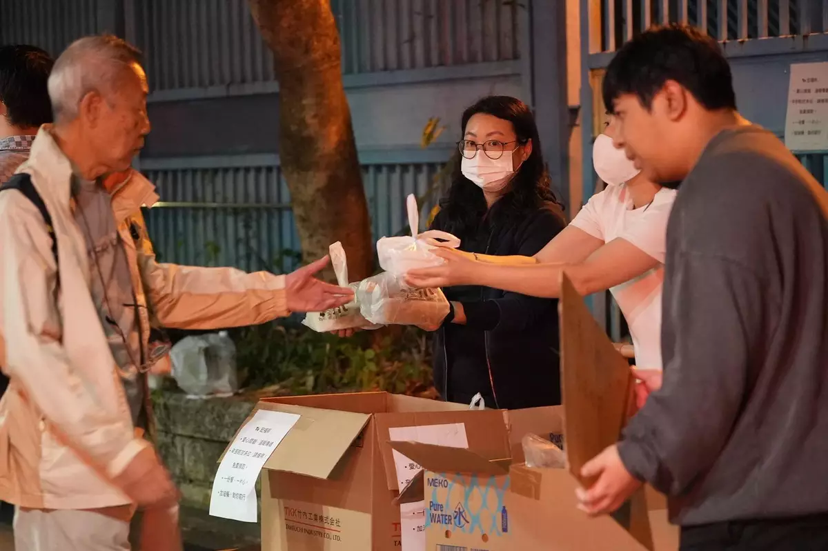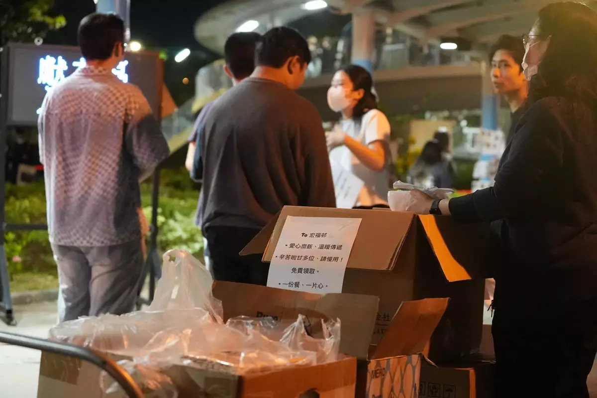 在獻花點出口位置,有市民自發組成小隊派發免費齋飯,供途經居民取用。派發者表示,希望讓下班後前來獻花、仍未用膳的市民可即時領取餐食,又稱「食齋可以為亡者祈福」。其間有市民接過餐盒致謝,亦有人婉拒,稱「請留給更需要的人」。派發者則反覆提醒「不用客氣,人人都可以領取」。