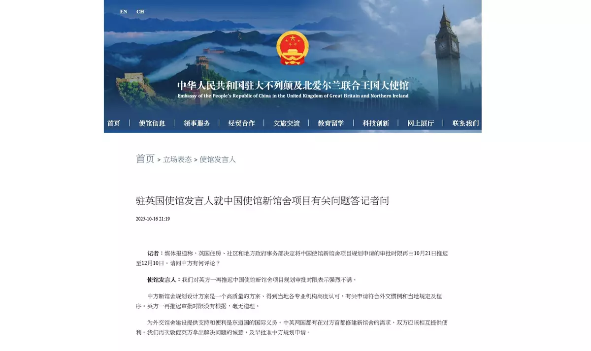 中國駐英大使館今年10月對英方一再推遲中國使館新館舍項目規劃審批時限,表示強烈不滿。中國駐英大使館網頁截圖