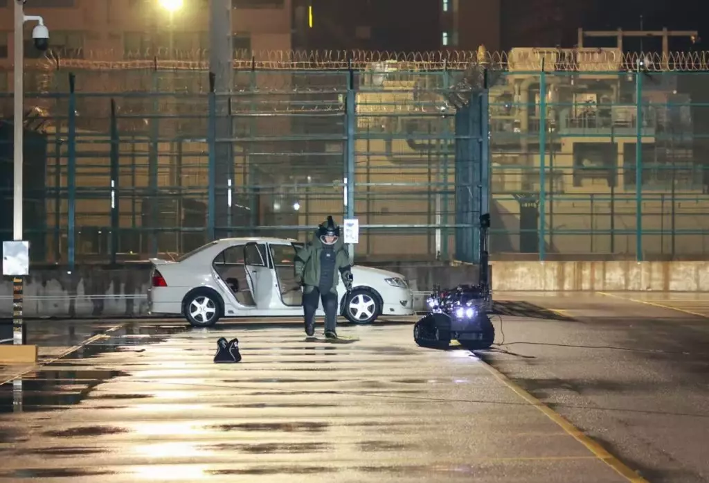 接報後,機場警務處與機場保安員即時封鎖現場並展開搜索。警方透過監控設施發現被捕男子曾將車輛停泊在機場南面停車場,經進一步檢查後,在車內發現一個可疑行李袋,鑑此,機場警務處隨即封鎖停車場範圍,並迅速進行人員疏散。