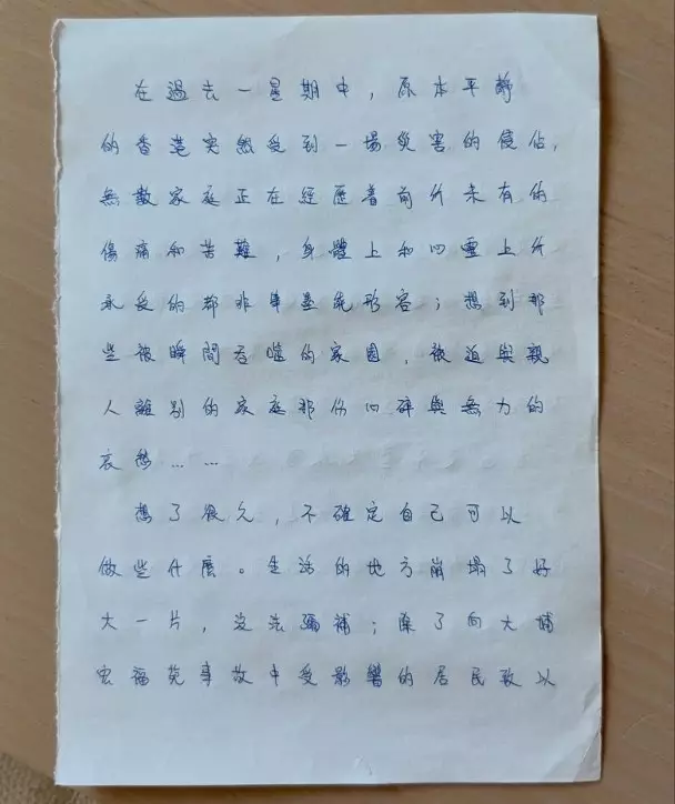 炎明熹(Gigi)親撰手寫信向災民送暖。
