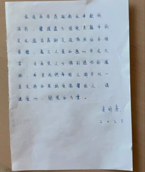 同心救災|炎明熹撰手寫信 慰問宏福苑災民: 你並不孤單