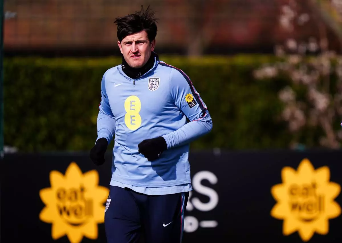 2026年3月30日周一,英格蘭球員哈利馬古尼在倫敦進行訓練。 (Bradley Collyer/PA via 美聯社) AP圖片
