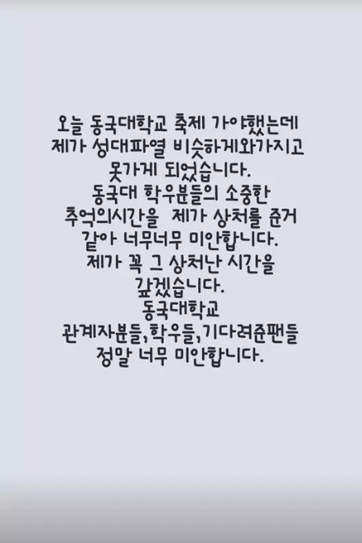 李洪基在貼文中寫道:「今天本來要去東國大學慶典,但因為我的聲帶幾乎破裂,無法前往,好像破壞了東國大學同學們寶貴的回憶,真的非常非常抱歉。我一定會彌補這段遺憾的時光。對東國大學的相關人士、同學們以及一直等待的粉絲們,真心道歉。」東國大學總學生會隨後發佈緊急公告,確認收到藝人方臨時取消通知,並向學生表示歉意:「原定今日的FTISLAND演出因藝人方原因取消,特此向同學們告知,敬請諒解。」消息一出,許多粉絲在學生會貼文下留言為李洪基加油,盼他早日康復。