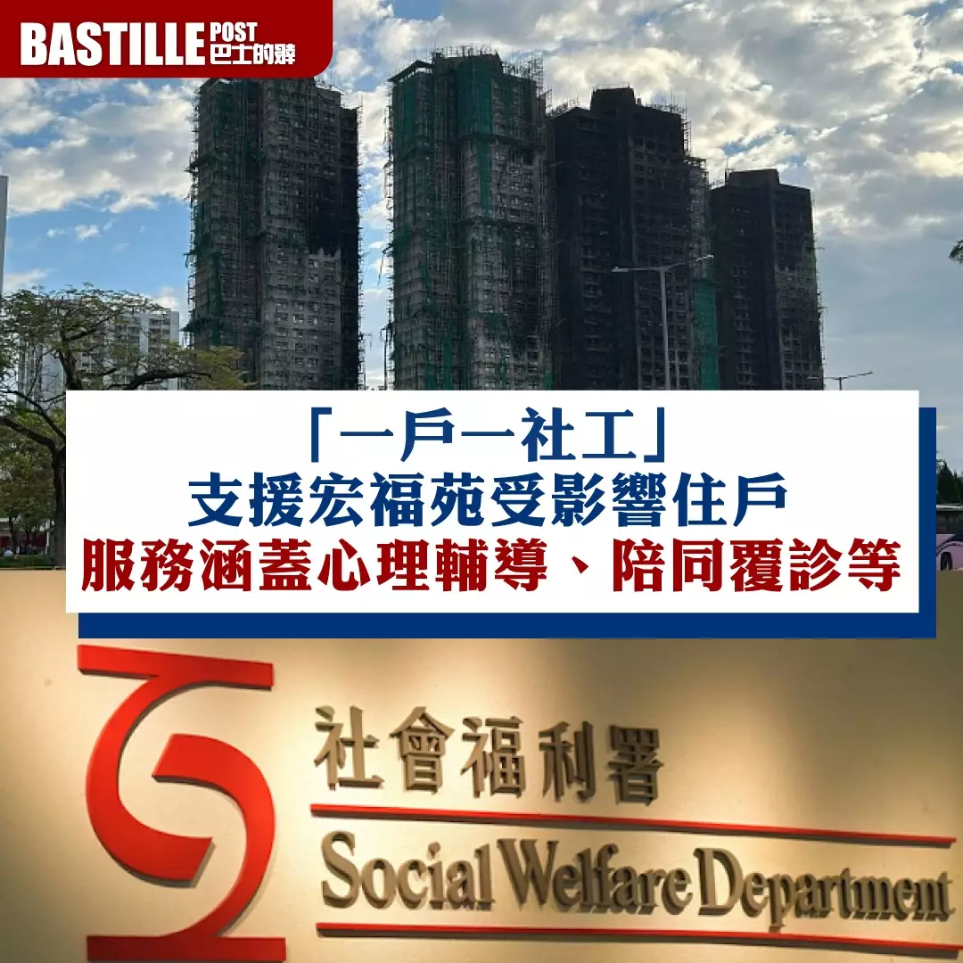 因應大埔宏福苑五級火,社署署長杜永恒在一個電台節目表示,現時已經有超過1600戶受影響住戶登記一戶一社工服務,每名社工都會向住戶提供手機號碼,以便他們任何時候包括辦公以外時間,可以聯絡到社工。而除了社工外,每戶亦有兩至三名公務員協助。